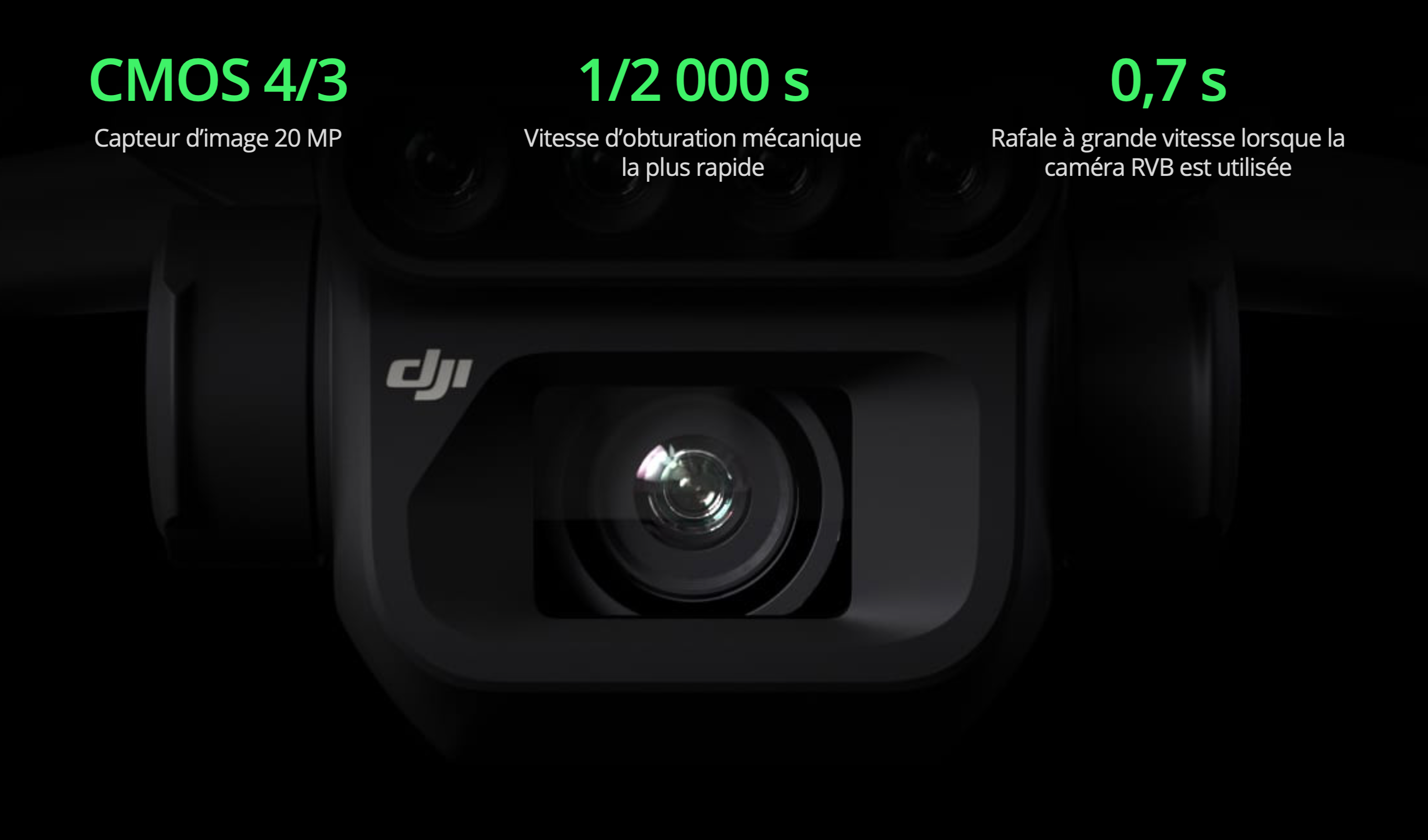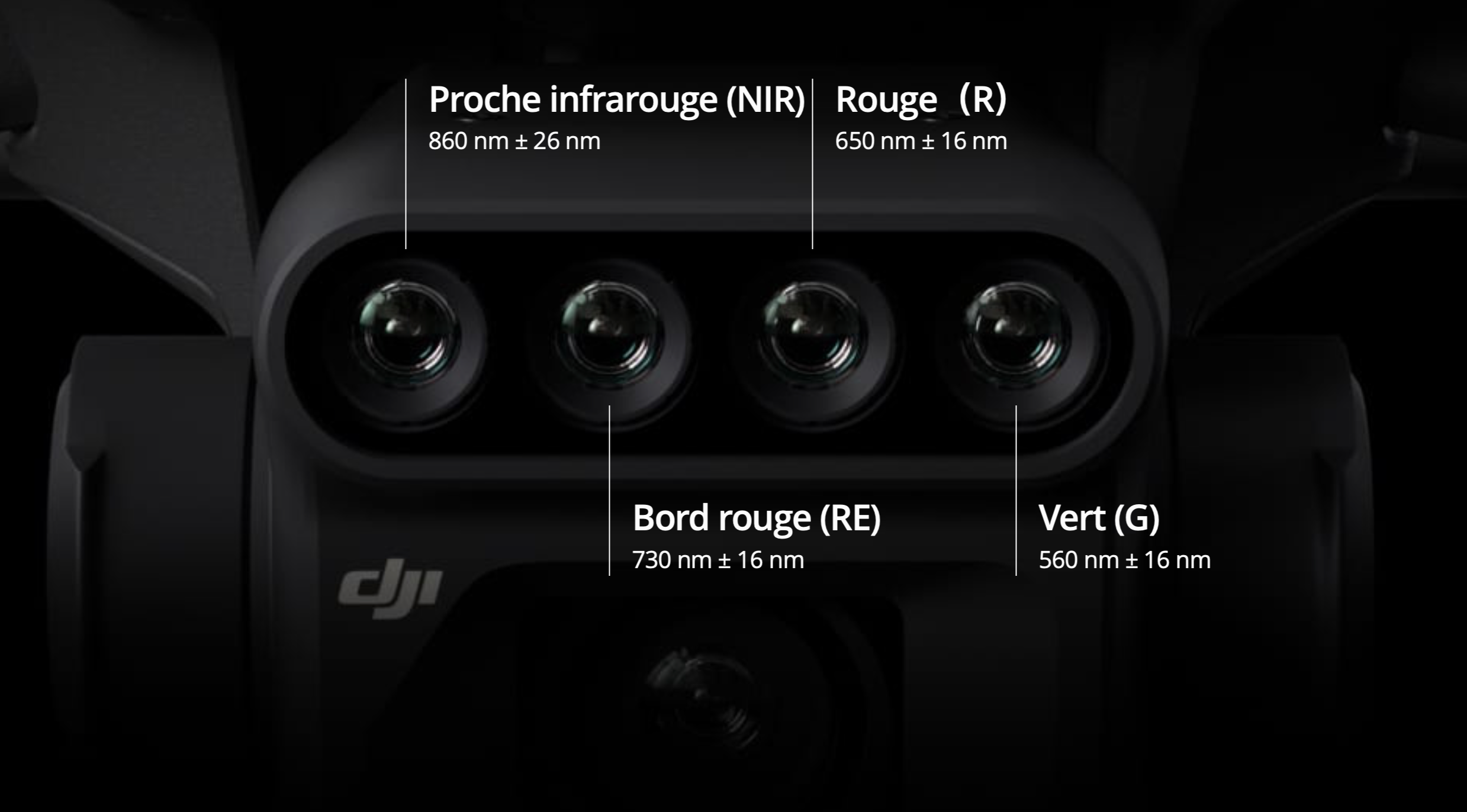 4 capteurs multispectraux (Vert, Rouge, Bord Rouge, Proche Infrarouge – 5 MP chacun)